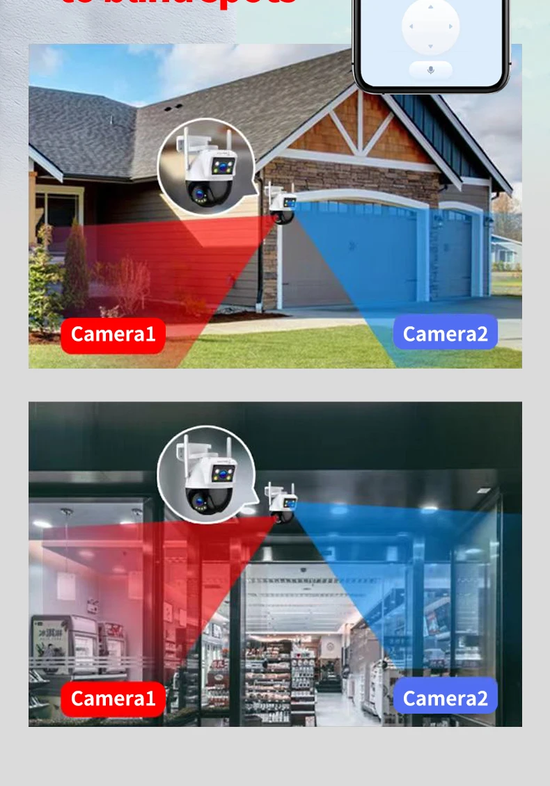 There are 2 video screens in APP, the upper one is fixed position camera and the lower one is PTZ camera.