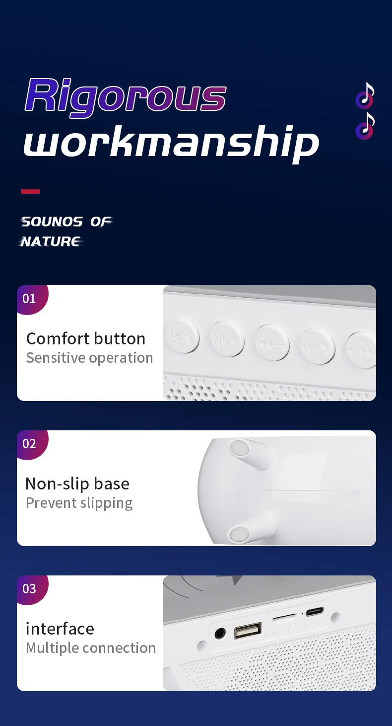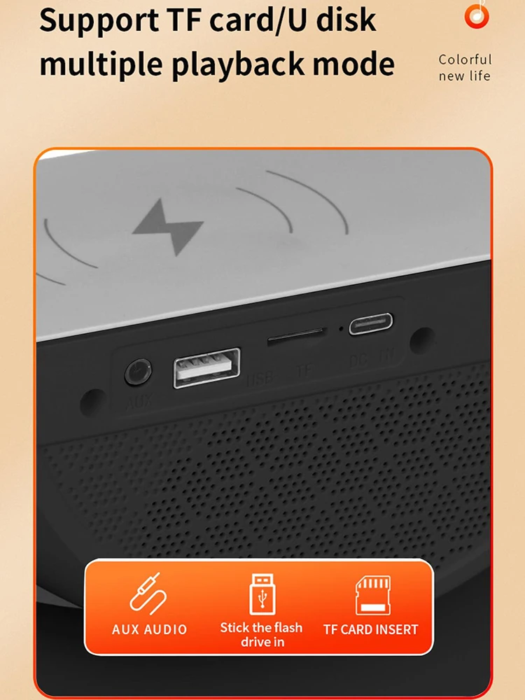 Product Information roductsize:236*236*80mm/9.29*9.29*3.15in Net weight of product : 778g Wireless charging power : 5W Bluetooth version : Jerry 6965 V5.2 Channel mode :mono+diaphragm lorn specification:052mm/2.05in,405W Diaphragmspecification:50*90mm/1.97*3.54in Specification of lamp beads:dazzling 5050LED+17 pieces Bluetooth distance:>10M Frequency response:20Hz-20KHz Charging parameters: TYPE-C 5V1A Battery capacity: 1800mAh Connector Type: USB Recommended Uses For Product: For music players Control Method: Application speaker Special Features: Shock-resistant Certifications: FCC Audio Output Mode: Surround Wireless Communication Technology: Wi-fi Water Resistance Level: Not water resistant Mounting Type: Tabletop Supported Internet Services: Apple Music Controller Type: App control Surround Sound Channel Configuration: 5.2 Connectivity Technology: Wi-fi Power Mode: USB Charging
